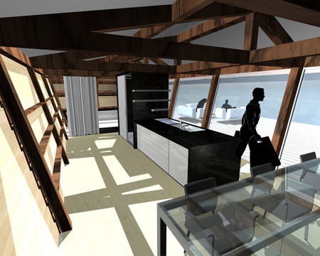 Polygon Resort is a floating resort concept that can make room for up to 6 people using the minimum area. The concept focuses on exploring the shelter and approaching the contrast between the structure and a flexible roof formed of flexible canvas. This concept has the ability to collect solar energy through embedded flexible solar panels on the canvas and reusing the natural flow of rainwater over the cover by collecting them in strategic holes on the ground. It comprises modular furniture that allows basic living for the user, while the space usage compatibility was inspired by usual tent, allowing people enjoy the space freely. Moreover, it offers a double bed and additional 4 more beds stored on the kitchen.