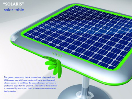 Green Innovations are growing fast these days. Various innovations, designs and inventions are created almost everyday. Joining with the green innovator, inventors and designers is Iulius Lucaci of the United States that created the Solaris Solar Table. With the use of the solaris, the collected energy is stored in the table is now used to power up laptops, MP3 players, and other electronic devices during the time that they are far from electrical outlet. In this way, people don’t need to worry if they will run out of batteries because they can easily recharge it with the solaris. The table has 144 solar cells that produces approximately 400mA at 0.53Volts and has a power output per cell of .0216 Watts.