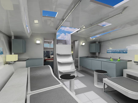 The lightness & hydrodynamic efficiency of the craft have an important effect on the engine propulsion system. The outstanding lightweight & advanced hull of the V 50.02 Hybrid & a high performance under sailpower, means installation of a reduced power engine & significant savings in fuel consumption. Not only, but choosing an engine with NOx, HC&PT emissions is approved by the stringent restrictions of the GreenStar notation concerning ’emissions of internal combustion engines’.